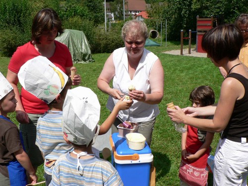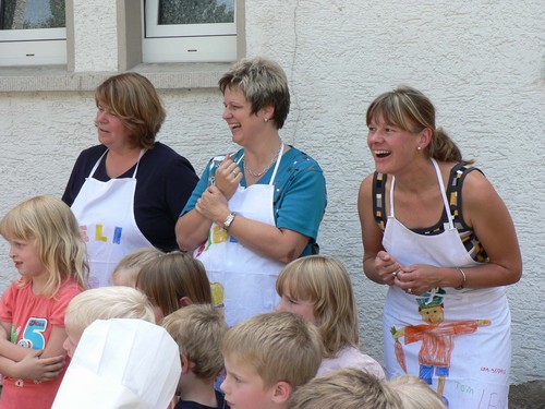 Alt begrüßte zu der Abschiedsfeier alle Eltern, Großeltern, Paten und Geschwister. Als Erfrischung bei dem hochsommerlichen Wetter servierte sie mit ihren Kolleginnen Angelika Raible und Sabine Springmann den Gästen einen eisgekühlten