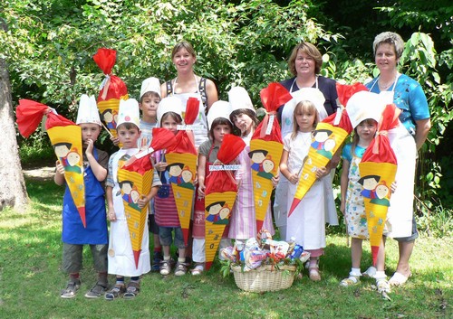 Das Bild zeigt die zukünftigen Schulanfänger als Köche verkleidet mit ihren Max und Moritz-Schultüten sowie die Erzieherinnen. Vorne von links gesehen: Tom Schirk, Stefan und Martin Weigold, Lea-Sophie Burkhardt, Paula-Marie Schäfer, Franka Breier, Rebecca Dettling und Leonie Schweikert. In der hinteren Reihe (von links) Kindergartenleiterin Melanie Alt sowie die Erzieherinnen Angelika Raible und Sabine Springmann.