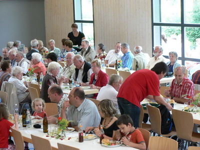 vom Kindergarten sowie den Konfirmanden mitgestaltet. Anschließend ging es statt in den Pfarrgarten zur Glatttalhalle hinüber. Ein Teil der Gäste hatte sich auf den aufgestellten Festgarnituren längsseits der Halle niedergelassen