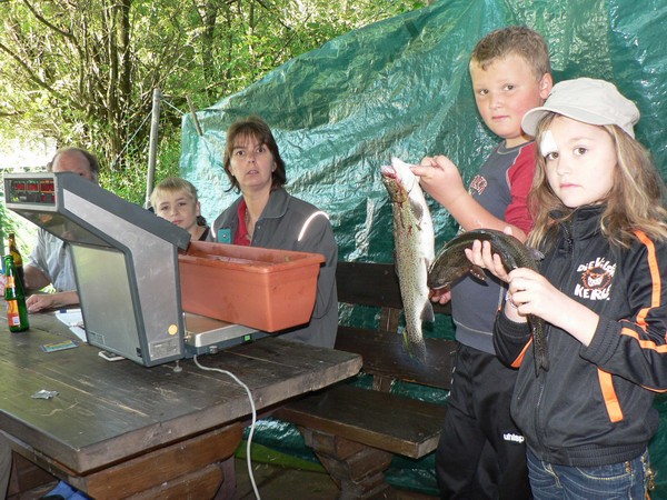 Mit dem Kinderfischen betrieben die Angelfreunde Werbung in eigener Sache. Der Nachwuchs sollte nach den Worten des Vorsitzenden Emil Schrägle durch die Veranstaltung gefördert werden. Das Interesse für den Angelsport zu wecken ist mit dem Kinderfischen auch bestens gelungen. Mit dazu beigetragen hatte das herrliche Sommerwetter. Gefischt wurde (wie beim Königsfischen der Aktiven) an den Weiheranlagen im Ortsteil Dobel. Viele der Kinder wurden von ihren Eltern oder Opas begleitet. Um ein schonendes und fachgerechtes Fischen zu gewährleisten, gingen die aktiven Fischer den Kindern zur Hand. Unter fachmännischer Anleitung wurde der Köder am Haken befestigt und die Angel ausgeworfen. Aufregend wurde es, als ein Fisch angebissen hatte und das Wasser aufspritzte. Mit vereinten Kräften und mit Hilfe eines Käschers wurden die Fische „an Land“ gebracht. Interessiert schauten die Kinder zu, wie man die Fische ausnimmt und filetiert. Jeder Teilnehmer durfte einen Fisch fangen und mit nach Hause nehmen. Der größte Fisch mit 2868 Gramm hatte bei Larissa Heindel angebissen. Ihr folgten Sophie Deak (2100 Gramm) und Krischan Kunz (1510 Gramm). Bei der Siegerehrung erhielten die kleinen „Petrijünger“ von Carola und Ingo Herr eine Urkunde zur Erinnerung. Pokale gab es vom ersten bis zum dritten Platz. Der Rest durfte sich über eine Medaille freuen.