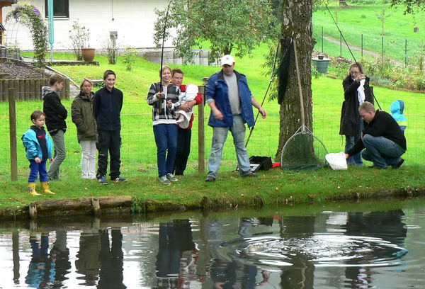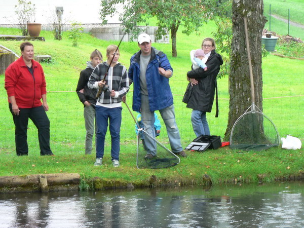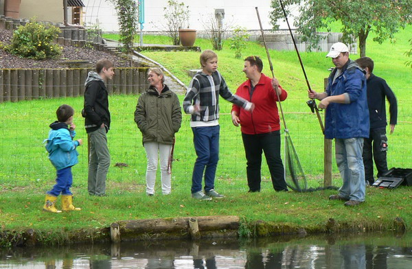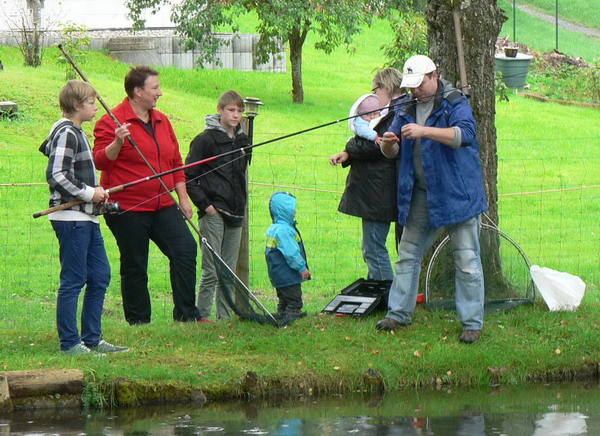 Dobel gemacht hatten. Die Kinder wurden zum Teil von ihren Eltern, Opas oder Paten begleitet. In den Regenpausen herrschte an dem Weiher reger Betrieb. Um ein schonendes und fachgerechtes Fischen