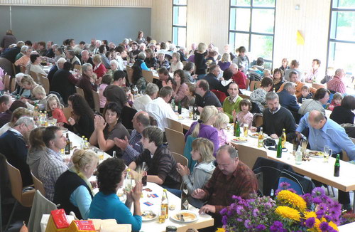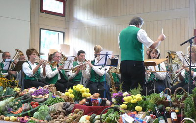 Pfarrer Christoph Knoke freute sich riesig, dass die Halle voll besetzt war. Die Sonne habe den Gottesdienstbesuchern am Morgen den Weg gezeigt und nun lache sie einem auch ins Gesicht, so Knoke freudig. So könne man auch wirklich von Herzen fröhlich sein und „Danke“ sagen. „Danke“ wolle man auf ganz verschiedene Art und Weise sagen. Einmal für den Schmuck und für die vielen Erntegaben, die auf der Bühne liebevoll aufgebaut wurden sowie durch die Lieder und Gebete. Die Kinder vom Kindergarten kamen mit kleinen Körbchen auf die Bühne. Neben zwei Liedern führten sie die Geschichte von der Maus Frederik auf, die statt Futter Sonnenstrahlen für den Winter einsammelte. Für ihr Mitwirken bedankte sich Pfarrer Christoph Knoke beim Kindergarten und beim Posaunenchor ganz herzlich. Die kompletten Erntegaben sowie die Hälfte des Opfers vom Gottesdienst wurden dem Tafelladen in Sulz gespendet. Die andere Hälfte wird für die Erhaltung des Kindergartens in kirchlicher Trägerschaft verwendet. Nach dem Gottesdienst wurde zum Frühschoppen mit dem Musikverein Hopfau und zum Mittagessen eingeladen. Von dem schmackhaften Mittagstisch wurde reger Gebrauch gemacht. Nach dem Mittagessen wurde abschließend Kuchen zum Mitnehmen angeboten. Auch dieser Erlös kommt dem Kindergarten zugute.