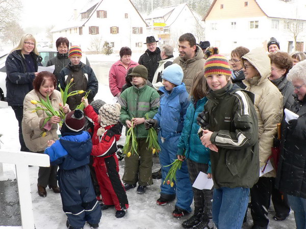 waren die wichtigsten Stationen des Ladens beinhaltet. Am Ende des Liedes überreichten ihr die Kinder als kleines Dankeschön Blumen. Die total überraschte und sichtlich gerührte Gerda Kummer bedankte sich für das Lied und