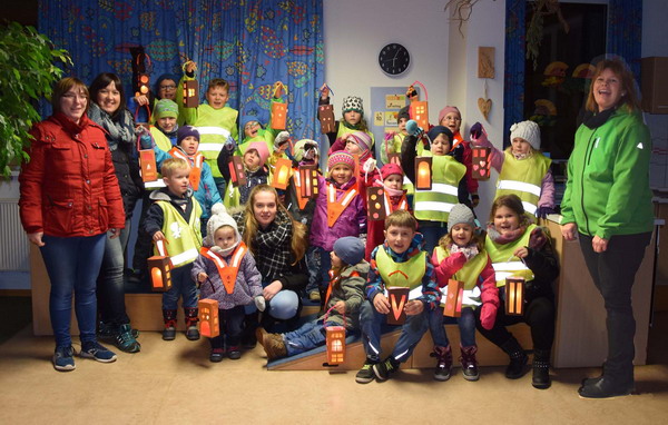 klassische Laternen mit dem Aussehen der einstigen Holzlaternen gebastelt. Zur Begrüßung und Einstimmung auf den Umzug wurde das Lied „Laterne laufen wir heut‘ Nacht“ gesungen.Teilgenommen hatten 15 Kinder vom Kindergarten und sieben Kinder aus