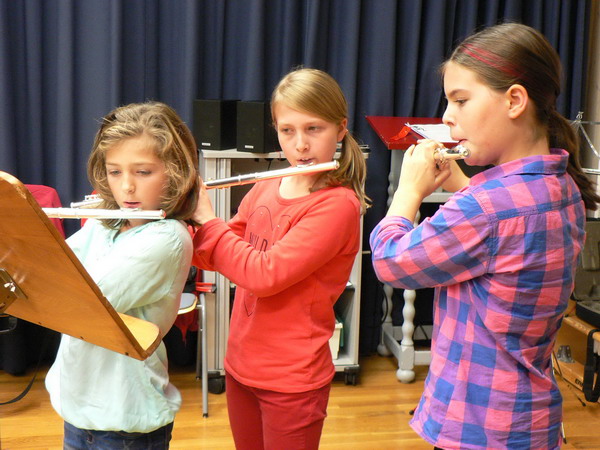 Die Bilder zeigen die Gruppe der Klarinetten mit Leonie Maier, Melissa Brett, Leonie Schweikert, Romina Pfau und Mandy SchrÀgle zusammen mit Dirigent und Musiklehrer Ferenc Gut, Martin und Stefan Weigold, Sonja Effinger und die Gruppe der Querflöten.