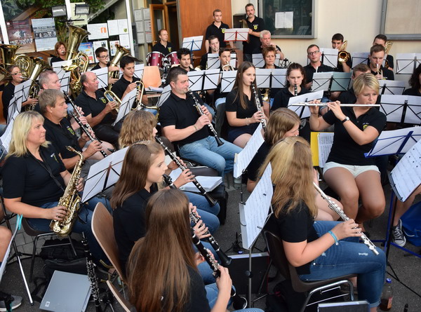 Scharen auf den mitten im Ort gelegenen Festplatz. Dirigent Arne Schauer und seine 50 Musikanten boten mit ihrem breiten Repertoire beste Unterhaltung. Symbolisch wurde der Abend mit dem Marsch