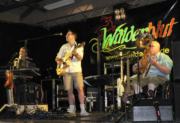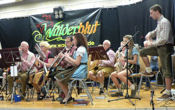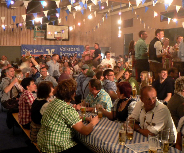 Nach ihrer Einquartierung in den örtlichen Gastronomiebetrieben und privaten Unterkünften eröffnete Dirigent Helmut Schäfer mit seinen 30 Musikern in der weiß-blau geschmückten Glatttalhalle das Oktoberfest mit zünftiger Blasmusik. Da vom Bierlieferant kein geeignetes Fass Bier zur Verfügung gestellt werden konnte, fiel der geplante offizielle Fassanstich aus. Dies tat der Stimmung aber keinen Abbruch. Reißenden Absatz fanden die Schweinshaxen und die Hähnchen sowie das Bier aus Maßkrügen. Die Musiker aus Österreich heizten mit ihren schwungvollen Melodien die Stimmung an und kamen den geforderten Zugaben gerne nach. Danach war die Bühne frei für die Stimmungskapelle „Wälderblut“. Mit ihrem fetzigen Programm vom Alpenrock über Schlager bis zum Klassiker aus der Tanzmusik sorgten sie für eine tolle Stimmung unter den Gästen. Von der ersten Minute an schafften sie es, das Publikum mitzureißen. Gestandene Mannsbilder in Lederhosen und fesche Madel in Dirndl standen auf den Bänken und feierten ausgelassen ihr Oktoberfest. Immer wieder kam von „Wälderblut“ das Kommando „Wo sind die Hände?“ und „Die Krüge hoch“. Bei dem meist jüngeren Publikum war deshalb eine gute Kondition notwendig. Bis weit nach Mitternacht herrschte Oktoberfest-Stimmung pur.