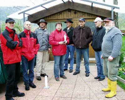 Das Bild zeigt den Hopfauer Ortschaftsrat mit Ortsvorsteherin Daniela Wittig (Bildmitte im roten Anorak) sowie Emil SchrĂ€gle als Vorsitzender der Angelfreunde Dobeltal (ganz rechts) vor der FischerhĂŒtte (dem âSeehotelâ) am Dobelweiher.