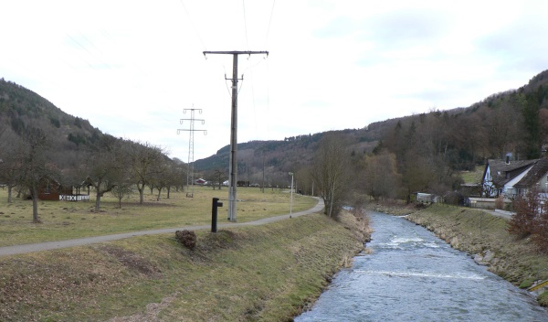 auf der rechten Flussseite beginnt etwas unterhalb der Einmündung des Dobelbaches und erstreckt sich über rund 90 Meter, bei