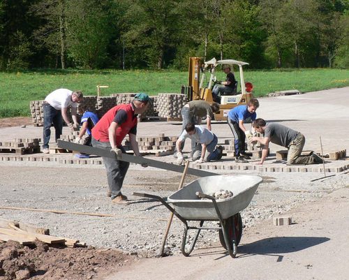 Öko-Pflastersteine, die einem Parkplatzneubau weichen mussten, erworben werden. Das Aufsetzen und Reinigen der lose auf die Wiese