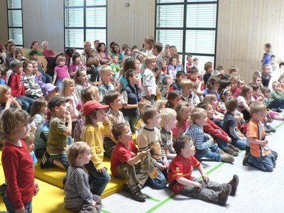 großer Begeisterung. Begleitet wurden sie zum Teil von ihren Eltern und Großeltern, die im hinteren Teil der Halle die Aufführung verfolgten. Mit Spannung öffnete sich der Vorhang. Kater Findus hatte irgendwann