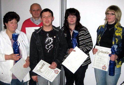 Peter Noll und sein „Vize“ Walter Sturm für ihre zehnjährige Mitgliedschaft Eva Baumann, Nicole Schrägle, Klaus-Dieter Springmann sowie