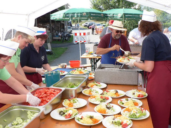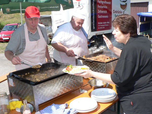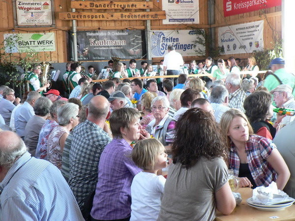 Ein Garant für den Erfolg war das herrliche Spätsommerwetter. Nach und nach füllte sich am Samstagabend zum Auftakt der Hockete der wunderschön dekorierte Geräteschuppen der Familie Kußmaul auf dem Brachfeld und die aufgestellten Pavillons. Eingefunden hatten sich so manche „Mannsbilder“ in Lederhosen sowie fesche Madel im Dirndl. Für Stimmung sorgte ab der ersten Minute die Tanz- und Showband „Tonight“ aus dem Badischen mit Willi am Keyboard und Sängerin Petra. Der Kontakt zu der Band war über den zweiten Vorsitzenden Reiner Schrägle entstanden. Er und Willi Kurz haben ihren Wohnwagen nebeneinander auf einem Campingplatz in Achern stehen und sind seit einigen Jahren befreundet. Begrüßt wurden die zahlreichen Gäste von Patrick Guhl. Er hatte im März des vergangenen Jahres das Amt des Vorsitzenden übernommen und wünschte einige gesellige Stunden. Sein Dank galt den Sponsoren und dem Musikverein Hopfau für die Übernahme der Bewirtung. Ein erster Höhepunkt und für Lacher sorgte der Sketch „Sparmaßnahmen bei der Morgentoilette im Altersheim“. Mit Rollis und an Krückstöcken liefen die Darsteller in ihrer Schlafkleidung durch das Publikum auf die Bühne und nahmen die strikten Anweisungen ihrer aufreizenden Altenpflegerin (dargestellt von Reiner Schrägle) entgegen. Wegen Sparmaßnahmen gab es nur einen Waschlappen für alle für die ganze Körperpflege von oben bis unten. Mit einer Klobürste wurden die Zähne geputzt. Das Wasser zum Spülen reichten die „Heiminsassen“ von Mund zu Mund weiter. Ferner wurde mit einer Gießkanne das Wasser zum Waschen der Hände verteilt. Für den Stuhlgang durfte sich jeder ein Blatt Papier von der Rolle abreißen. Den Inhalt ihrer Bettpfannen (Bonbons) warfen die Akteure zum Schluss ihres Sketches ins Publikum. Ein weiterer Höhepunkt der angekündigten „Mitternachtsshow“ war der Showtanz der „Sieben heißen Hüpfer“. Schrägle zeigte sich stolz darüber, dass sich die jungen Mädels vom Queenspark zu einer solch tollen Truppe zusammengefunden haben und sich beim Programm engagierten. Die Mühen der Proben hatten sich gelohnt. Mit ihrem fetzigen Auftritt begeisterten sie das Publikum. Als Belohnung gab es eine Einladung in die „Waldgeistbar“. Mit den Wahlen im Vorjahr hatten die Wanderfreunde den Generationswechsel in die Wege geleitet und eine neue, junge Vorstandschaft gewählt. Der Dank des zweiten Vorsitzenden Reiner Schrägle galt an dieser Stelle den Familien Birk und Noll. Sie hatten in den vergangenen 32 Jahren den Verein maßgeblich gestaltet, die Veranstaltungen organisiert und die neue Vorstandschaft unterstützt. Bis in die die späte Nacht hinein herrschte reger Betrieb. Das anfangs herrliche Wetter lockte auch gestern wieder eine große Besucherschar auf den Weiler. Zum Frühschoppen und über die Mittagszeit spielte der Musikverein Hopfau auf und bot eine zünftige Blasmusik vom Feinsten. Den Gästen wurde ein reichhaltiger Mittagstisch angeboten. Die Helfer hatten alle Hände voll zu tun, um dem Besucheransturm Herr zu werden. Ein großes Kuchenbüfett rundete das Angebot ab. Die Kinder vergnügten sich im aufgestellten Planschbecken und auf dem aufgeschütteten Sandhaufen.