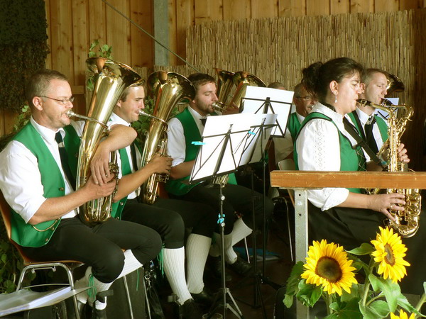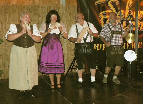 Um in dem zweijährigen Veranstaltungs-Rhythmus der Hockete zu bleiben feierten die Wanderfreunde ihren 30. Geburtstag vom vergangenen Jahr einfach nach. Bei dem herrlichen Sommerwetter konnte am Samstagabend zum Festauftakt ein ausgezeichneter Besuch verzeichnet werden. Der wunderschön dekorierte Geräteschuppen der Familie Kußmaul und die aufgestellten Pavillons waren sehr gut besetzt. Für Stimmung ab der ersten Minute sorgten „Die Schwarzwald-Buam“. Das Duo bot eine stimmungsvolle Unterhaltung für Jung und Alt und riss das Publikum mit. Ihr breites Repertoire reicht von klassischer Oberkrainer-Musik mit fetzigen Polkas bis hin zu aktuellen und bekannten Hits aus Schlager, Rock und Pop. Band-Chef Ralf Penz (zugleich Diplom-Musiklehrer) verschaffte dabei seinem 13 Jahre alten Schützling Sascha Schrägle einen grandiosen Auftritt. Bei einigen Musiken durfte er als „Tiger auf der Gitarre“ eindrucksvoll seine Fingerfertigkeit demonstrieren. Heitere Spiele mit dem Publikum lockerten das Programm zudem auf. So wurde beispielsweise die „Queespark-Hausmusik“ aus der Taufe gehoben. Drei Frauen stellten sich einem Wettkampf aus Jodeln und Alphornblasen. Dabei wurde auch ihre Trinkfestigkeit getestet. Zu der tollen Unterhaltung trugen auch Mitglieder mit einer zeitlich etwas vorgezogenen „Mitternachts-Show“ bei. Der „Queenspark-Nachwuchs“ wartete mit einem sehenswerten Tanz zum Thema „Bauer sucht Frau“ auf. Acht Frauen mit verschiedenen Berufen und Hobbys buhlten dabei um die Gunst des einsamen Schweinehirten Baumann. Zur Belohnung für ihre Mühen lud sie Moderator Reiner Schrägle in die Bar ein und überreichte ihnen zudem einen Kinogutschein. Etwas ruhiger ließ es die „ältere Generation“ bei ihrem Strumpfhosentanz angehen. Damit die Mitglieder der Wanderfreunde ihr Vereinsbestehen richtig feiern konnten, übernahm der Hopfauer Musikverein die Bewirtung.