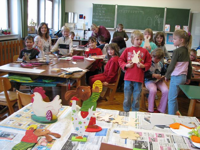haben Sieglinde Knoke und Iris Gruhner zusammen mit Klassenlehrerin Cathrin Waldern einen Laubsägen-Tag veranstaltet. Ausgesägt aus dem vom Schreinerbetrieb Gerhard Ade gespendeten Pappelholz wurden Osterhasen und Hennen, anschließend