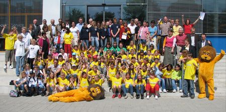 Mechthild Lauer, Vizepräsidentin des Landessportbundes und Vorsitzende der Sportabzeichen-Kommission erinnerte an die Geschichte des Sportabzeichen, beglückwünschte die Schüler zu ihren Leistungen und dankte den Lehrern für ihre Arbeit im schulsportlichen Bereich, die diese Leistungen möglich gemacht haben. Staatssekretär Georg Wacker vom Ministerium Kultus und Sport richtete die Grüße des Ministerpräsidenten und des Kultusminister aus. Spannend wurde es dann bei der Siegerehrung, als die Hopfauer auf den 2. Platz kamen und neben der Urkunde auch einen Gutschein im Wert von 200 Euro bekamen, der bei der Sportgeräte Benz eingelöst werden kann. Diese Firma sowie der „3-Löwen-Takt“ stehen hinter der Aktion, darum sind auch zwei der drei Löwen mit auf dem Bild.