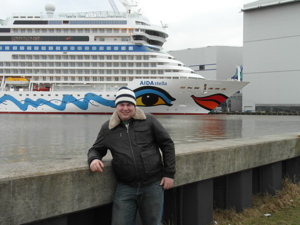 Tobias Pfau vor der AIDAstella in Papenburg, einen Tag vor der Emsüberführung.