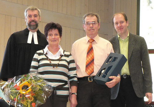 Im Frühsommer hatte die Kirchengemeinde verschiedene Arbeitsstellen zur Neubesetzung ausgeschrieben. Die bisherigen Stelleninhaber haben (oder werden demnächst) in Altersgrenze von 65 Jahren erreicht. Nach der derzeitigen Regelung des Kirchenbezirks müssen deshalb die Stellen neu ausgeschrieben werden. Auch die Arbeitstelle zur Raumpflege der Kirche und den Gemeinderäumen musste ausgeschrieben werden und konnte zum 1. Oktober wieder neu besetzt werden. Seit dem 1. Oktober 1996 hatten sich Lore und Arnold Vincon um die Reinigung der Kirche und den Gemeinderäumen im Pfarrhaus angenommen. Für die gut funktionierende Zusammenarbeit, das Miteinander und das Engagement bedankte sich Klautke recht herzlich. Immer sei man bei ihnen auf offene Ohren und tätige Hände bezüglich der Belange der Kirchengemeinde gestoßen, und dies auch immer wieder über die Tätigkeiten als Reinigungskraft hinaus, hob Klautke hervor. Dies sei in der heutigen Zeit nicht mehr selbstverständlich. Er bedankte sich für die treue Mitarbeit in der Kirchengemeinde. Die Verabschiedung in den Ruhestand war für Klautke deshalb auch mit einem weinenden Auge verbunden. Er hegt jedoch die Hoffnung, dass er beide auch in Zukunft immer wieder in der Gemeinde antrifft, sei es beim Kirchen- oder Rainbowchor, im Gottesdienst, wenn es irgend etwas um die Kirche herum zu erledigen gilt, oder als Helfer bei Gemeindefesten. Für all die Jahre bedankte sich Klautke im Namen der Kirchengemeinde mit einem Blumenstrauß sowie einem Weingeschenk und wünschte beiden alles erdenklich Gute sowie Gottes Segen. Den Dankesworten schloss sich Pfarrer Knoke an. Während ihrer ganzen Amtszeit hätten die Vincon’s ihre Arbeit mit einer großen Verlässigkeit verrichtet. Dies könne man nicht hoch genug schätzen.