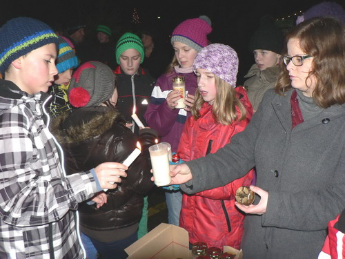 hinaus. Schon von weitem sah man den hell erstrahlenden Christbaum am Waldesrand stehen. Passend dazu wurde das Lied „Ein Lichtlein brennt“ und das Lied „Kleines