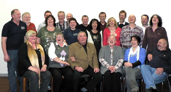 Das Bild zeigt (stehend, von links gesehen): Karl Baumann, Dieter Link, Frank Bezner, Heike Mayer, Johannes Sturm, Reiner und Sonja Schrägle, Georg Sturm, Elke Vincon, Martin Guhl, Heiderose Schrägle, Reiner Zinser, Reiner Vincon, Jörg Sturm und Carina Schulze. Vorne sitzend (von links): Anita Baumann, Heidi Noll, Georg Baumann, Inge Birk, Ilona Noll und Karl Birk. Georg „Schorsch“ Baumann sorgte während der Fotoaufnahmen mit einem Liedchen für Stimmung und brachte seine Mitstreiter damit zum Lachen.