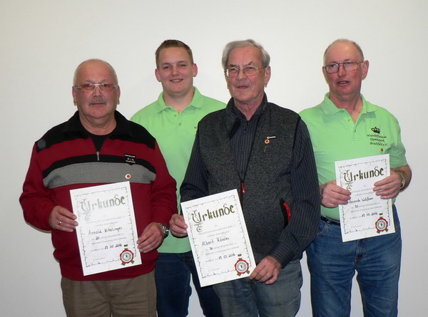 Im Rahmen ihrer Hauptversammlung zeichneten die Wanderfreunde Queenspark-Brachfeld langjährige und verdiente Mitglieder aus. Seit 20 Jahren gehört Arnold Kitzlinger aus Hopfau den Wanderfreunden an. Dafür überreichte ihm Vorsitzender Patrick Guhl die silberne Vereinsnadel. Bereits vor 30 Jahren hatten sich Albert Rössler und Heinrich Wößner aus Dornhan dem Verein angeschlossen. Für ihre langjährige Treue erhielten sie die goldene Vereinsnadel. Zudem überreichte ihnen der Vorsitzende als „Dankeschön“ eine Urkunde zur Erinnerung und eine Flasche Wein. Das Bild zeigt (von links gesehen) Arnold Kitzlinger, den Vorsitzenden Patrick Guhl, Albert Rössler und Heinrich Wößner.